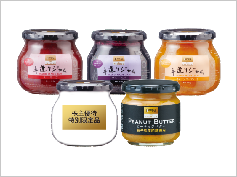 3月末日(中間期末)現在の株主名簿に記載された1単元(100株)以上所有される株主様1名につき、当社オリジナル商品1セットを贈呈いたします(6月上旬発送予定)。家庭でつくるように、果実を糖と果汁のみで煮詰めました。果肉たっぷり、当社が自信をもってお勧めする商品です。