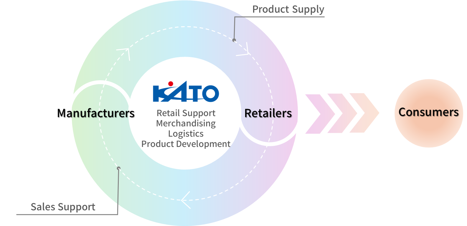 We are a comprehensive food wholesaler that sourcing products from manufacturers and distributing them to retailers nationwide. With 11 branches nationwide, we have grown by consistently accumulating trust through our role as a "bridge" between our three key stakeholders: manufacturers, retailers, and consumers.