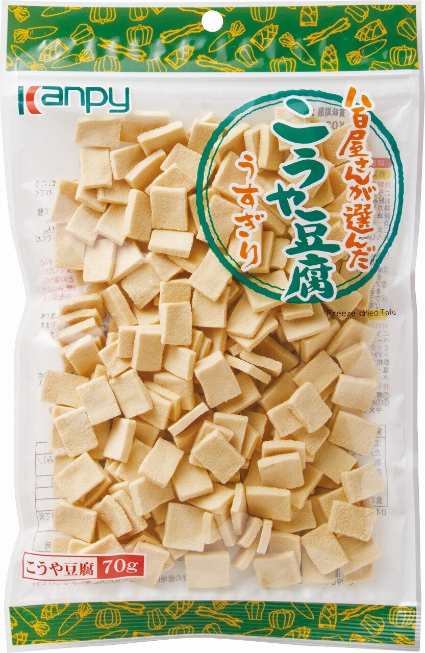 薄切りカットの高野豆腐です。水戻りが早く和風の煮物はもちろん、野菜炒め、汁物など、様々な料理にお使いいただけます。