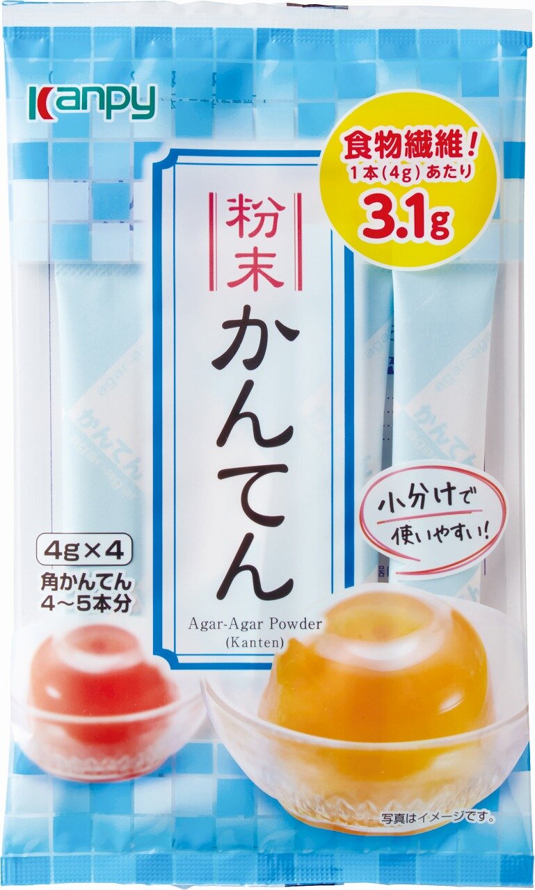 食物繊維たっぷりの粉末かんてんです。溶かすだけの「簡単」「便利」な粉末タイプです。1袋で角寒天4~5本分です。